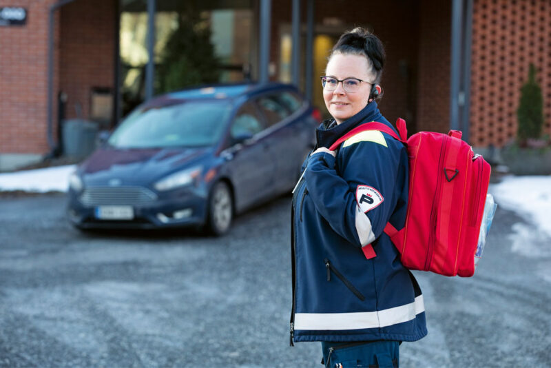 Työpäivän aikana Elinalle eteen tulee monipuolisia tehtäviä cystofixin vaihdosta autohuoltoon.
